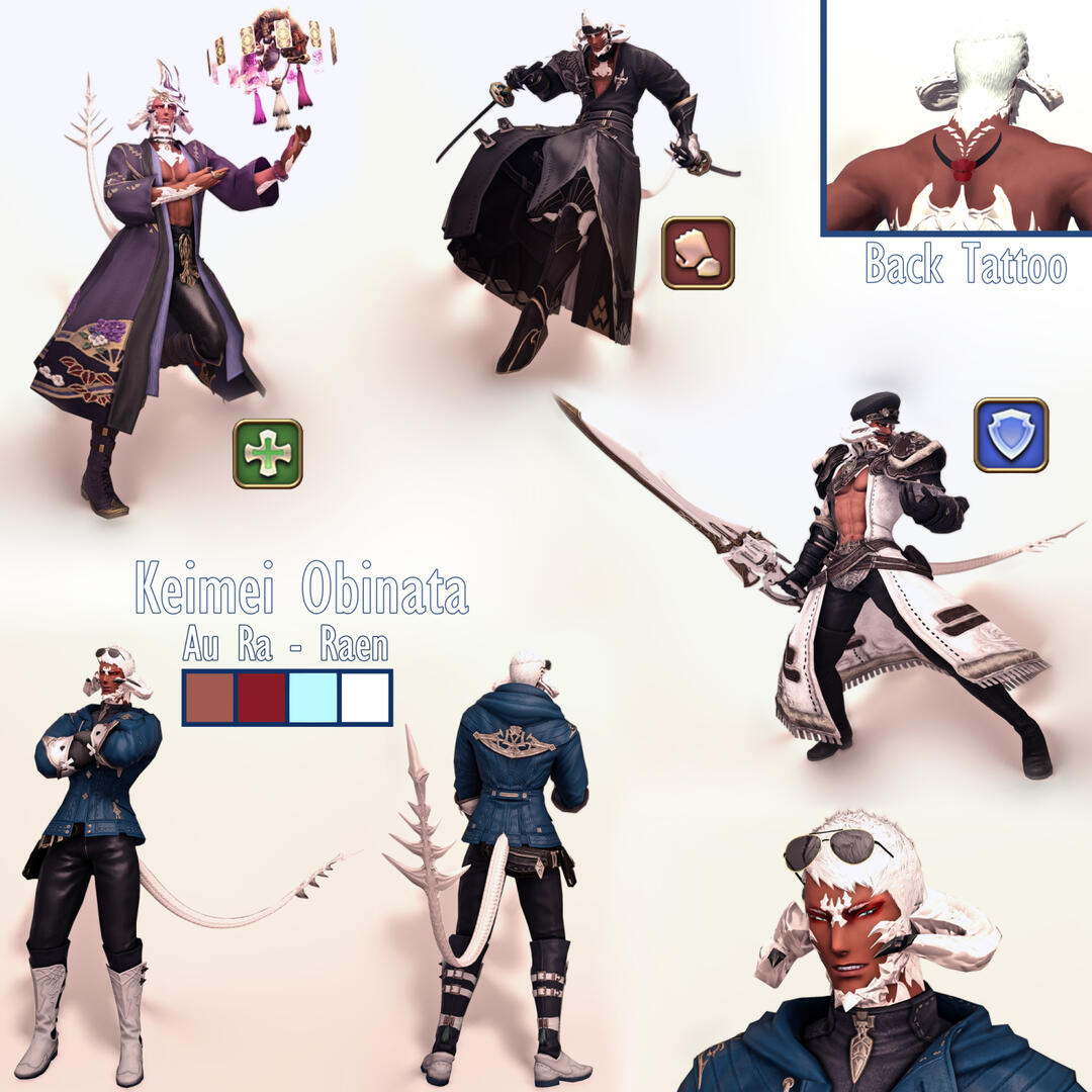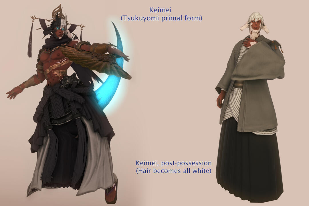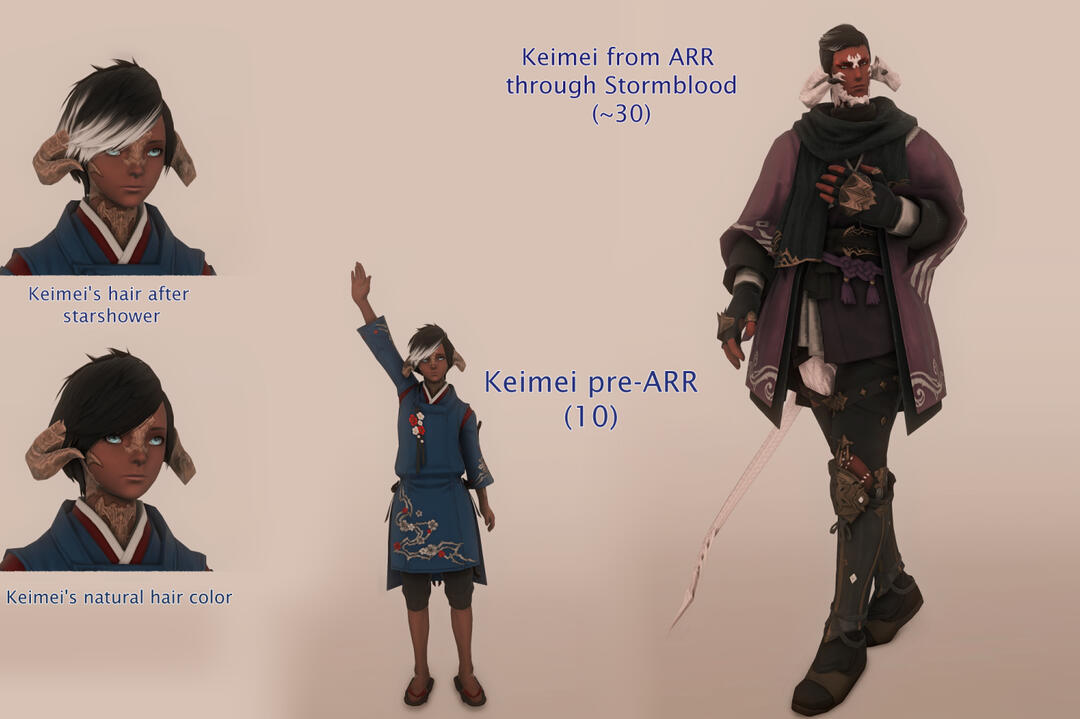 Backstory (pre- ARR)Keimei originated from the quiet village of Sui no Sato under the surface of the Ruby Sea. His father, Takeo Obinata, was the head Samurai of the Royal Guardsmen for the Ruby Princess while his mother, Mizuki, was a wandering Astrologian who fell in love and ended her journey to raise her and Takeo’s child. Takeo had forbidden Mizuki to share her studies with her son, for he wanted him to focus on his swordsmanship and continue the family practice of being a samurai. However, his mother secretly taught him her studies through the way of children stories and lullabies every evening before he went to sleep. One such lullaby was the story of the princess from the moon and how she fell in love with a powerful swordsman who freed her from her curse.Unfortunately, his mother quickly grew ill and passed away one night, leaving Takeo and Keimei with a rift in their relationship. After a fierce argument, the child Keimei ran away to the surface and begged the moon princess to return his mother's spirit. Though this did not happen, instead he was greeted by a gentle star shower, staining parts of his hair white. He heard his mother's voice that evening and since then vowed to continue her studies, trying to breach the gap of understanding the world's Kami and the gates of Heaven above in hopes of bringing his mother back to the world of the living.Keimei returns to Sui no Sato after that night goes about his days still trying to grasp what he witnessed that evening. Every night he would sneak out of Sui no Sato to reach the surface. On one occasion he meets a young Xaela boy around his age named Taimoorkhan Orl (or Tai for short) who he quickly grows fond of and encounters again on several more night trips. However, after hearing about a catastrophic disaster on the surface within the Steppe, he never saw Tai again. On another visit to the surface, he witnesses a young boy being smuggled onto a boat. When he tries to introduce himself, the only word he hears in return is “Fate” before watching the ship drift away.As for his samurai training, he had not been successful in obtaining the strength needed for this style of combat. But with the later help after being reuinited with his childhood friend Yugiri for whom he encounters in Doma on one trip, he was able to turn his training around and learned the way of the shinobi behind his father's back. This is because Yugiri identified his talents not in his strengths but in his agility and dexterity. However, despite learning this combat style, he only chooses to use this art as a means of self-defense.Once he became an adult, he parted ways from his homeland and wandered the various lands, sharing with any traveler who would listen of his astrological studies while trying to obtain new information he had not yet discovered.(ARR-Stormblood)After making his way back to Othard several years later, he encounters a young Xaela man who was seen roaming lost in the districts of Shirogane. The man introduces himself as Phaet Allity and Keimei quickly becomes smitten with him. They agree to become travel companions and help each other through their various adventures. After some time, Keimei can’t help but start to fall for the man but chooses to keep his feelings hidden.Coincidentally, they stumble into Taimoorkhan who had grown into a hardened and jaded figure. Their joyous reunion is cut short when Tai tries to warn Keimei of the threat his companion Phaet brought. Keimei becomes hurt by his words and chooses to protect Phaet while distancing himself from Tai. This comes spiraling back at Keimei when he begins to learn the truth of Phaet’s past and identity, both of which was dark and painful.After the liberation of Doma, Keimei eventually hears word of a special treasure obtained by the Kojin tribe. A mirror said to be an item linked to a moon spirit. Keimei becomes obsessed with trying to learn more and after venturing forth to witness the mirror for himself, he hears that familiar voice once heard on the beach during the star shower so many years ago. He makes a trip back to Sui no Sato to confront his father of his discoveries. What he thought would be a happy meeting resulted in anger and discourse. Takeo told Keimei to give up his childish ways and demanded he returned home to fulfill his duties. With his heart shattered, Keimei steals his father’s sword that evening and returns to the Kojin tribe. His mind had snapped and, while in a trance, he defeated the Kojin guards and touches the mirror becoming possessed by the primal within. With the help of Phaet and Tai, he is brought back to his original state and spends the next few days recovering in peace within his childhood home. His father, now with a changed heart after almost losing his son, tells him the truth. His mother was once the vessel for the moon primal so many years ago until he approached her and saved her. This left her body weakened and they both knew one day Mizuki would pass on. Takeo took it upon himself to rid the mirror in the Ruby Sea in hopes no one would find it again.After the events that unfolded, Keimei accepts his mother’s death, and he would no longer pursue a means to bring her back. He realizes life’s fragility and, in this moment, confesses his love to Phaet and tells him he would continue to stay by his side.(Shadowbringers-present)Keimei begins to doubt his own abilities in protecting his loved ones, including Phaet. During a difficult battle encounter in Werlyt against the Diamond weapon, Keimei’s mind is transcended to a place frozen in time. Unlike his visions in the past, this time he is met face to face with the weaponized Primal Alexander where he receives a Gunblade. He is brought back to his current realm with a heavy heart after the events. He continues to feel inadequate in his ability to protect his loved ones and ventures forth to lean to hone his new weapon. However, with his mind continuing to be clouded in doubt, he 